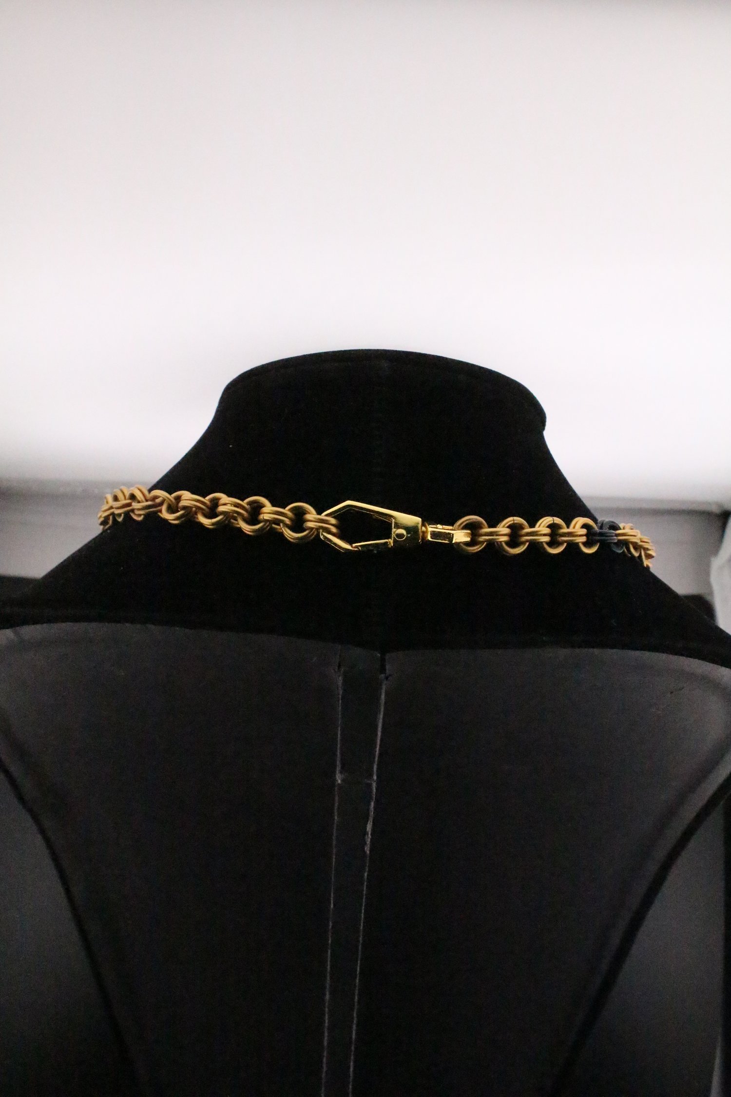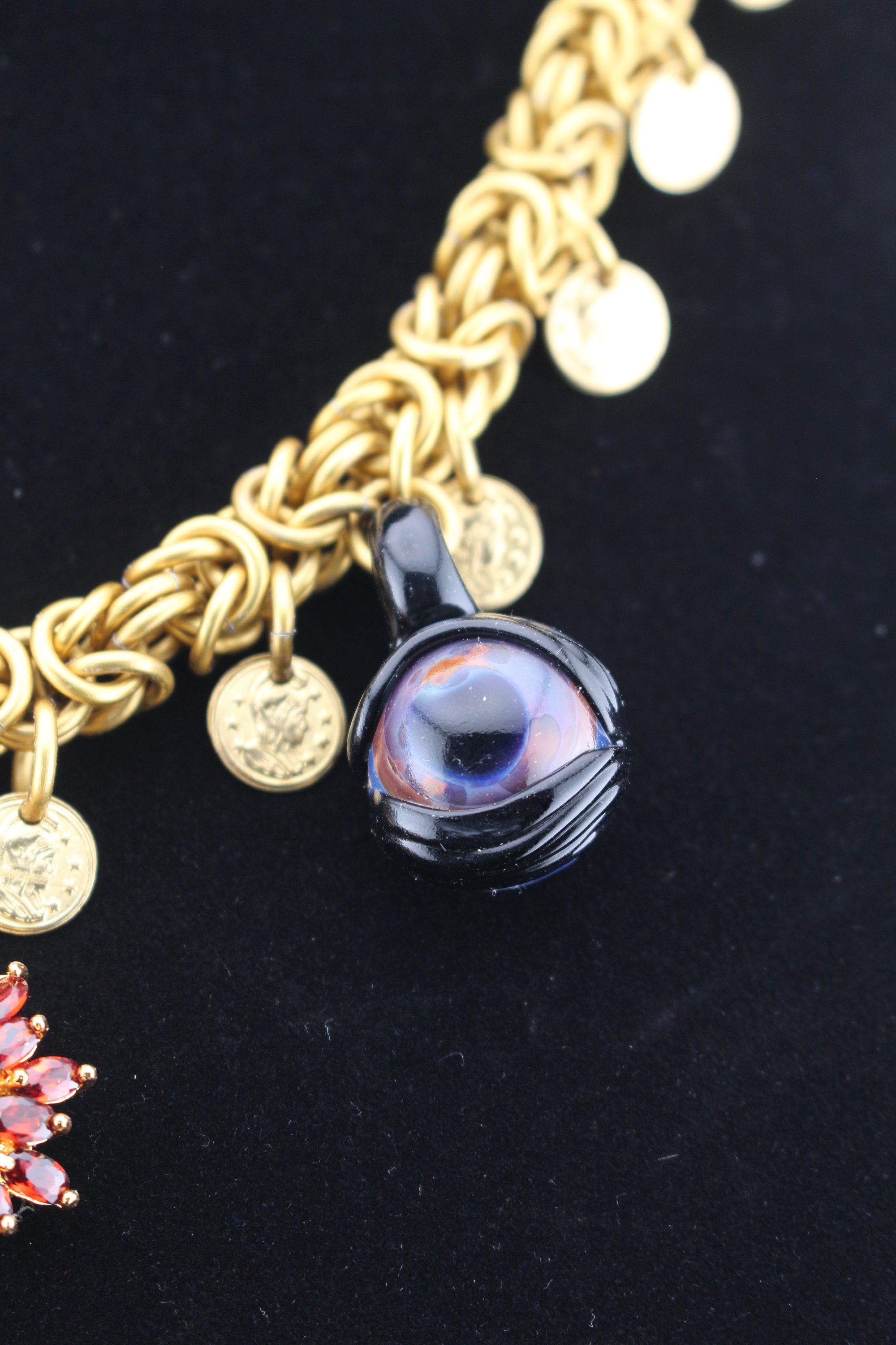 Aluminum chainmail necklace crafted from gold anodized links. Features eye pendants made by @MalcolmFordGlass, mini coin charms, and a garnet pendant.