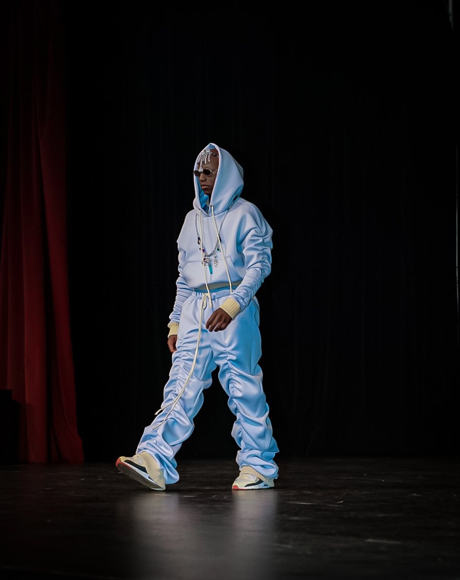 Sweatsuit made from scuba knit + rib knit fabric and extra long diamond braided rope drawstrings with agletted ends (metal tips).